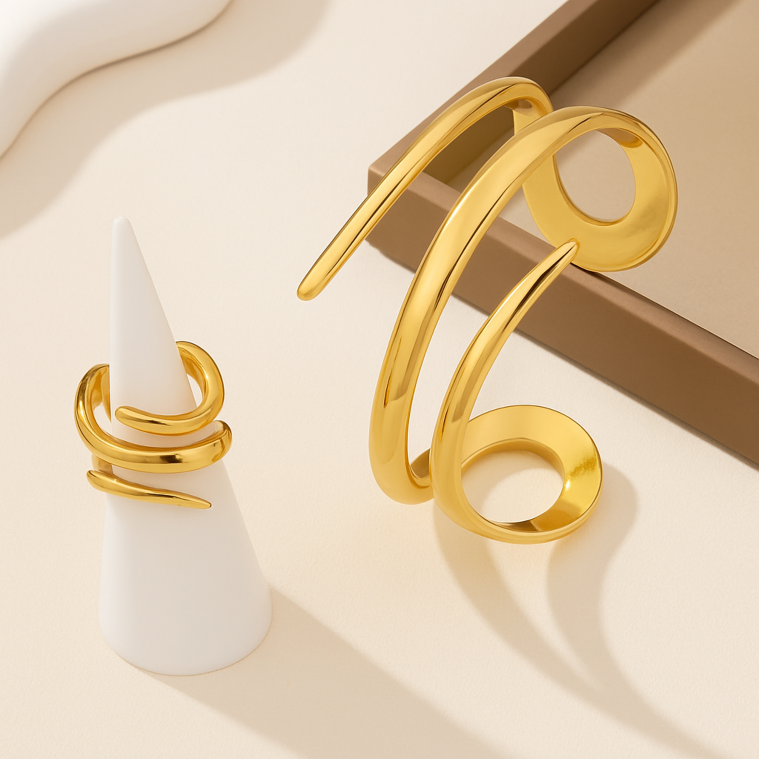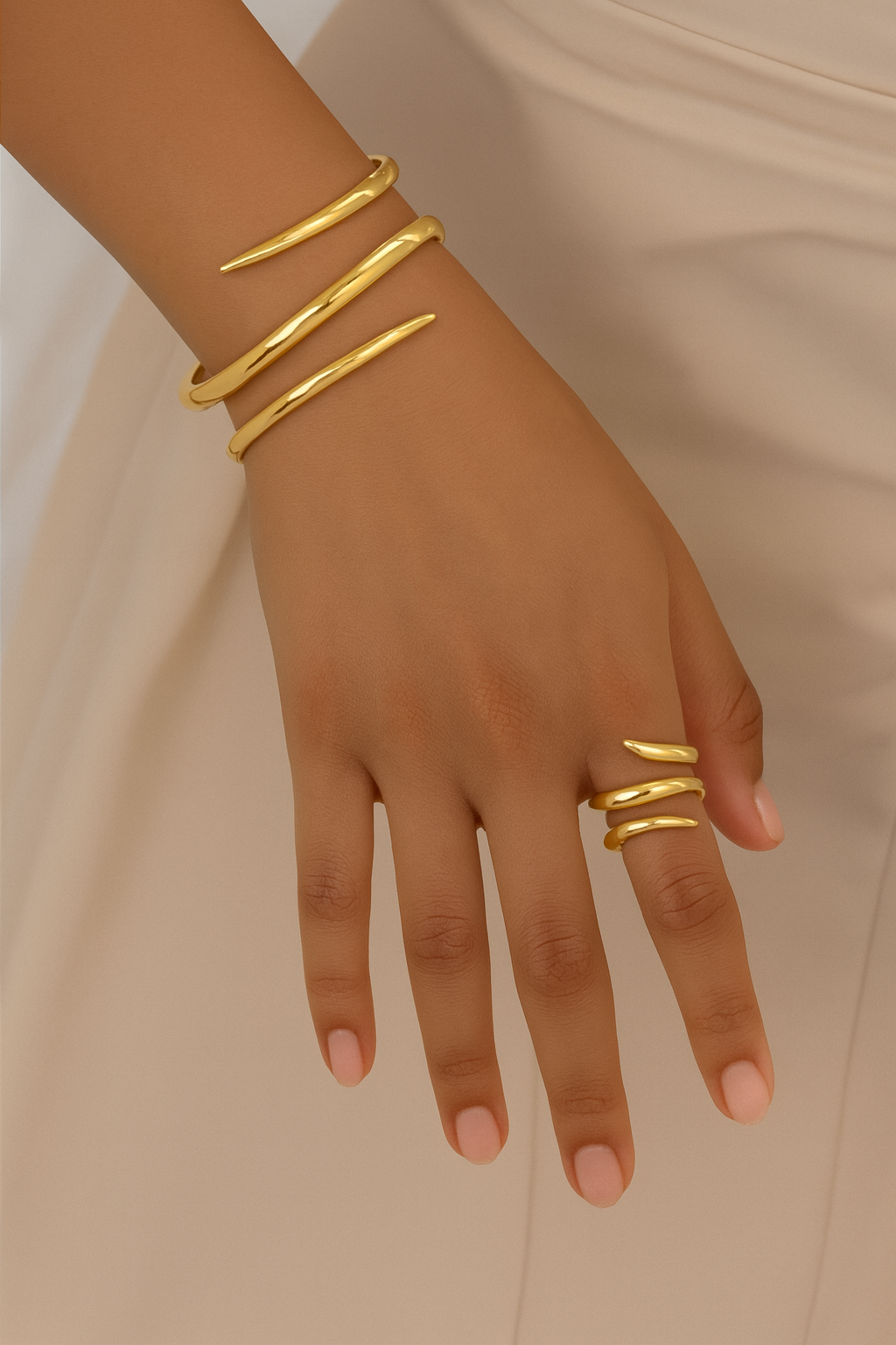 Le bracelet épouse délicatement le poignet, tandis que la bague, assortie, prolonge la ligne fluide d’un mouvement continu comme une vague figée dans le métal.